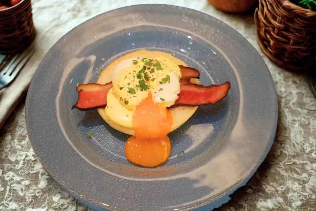 とろけるポーチドエッグを焼いたマフィンの上に乗せて。