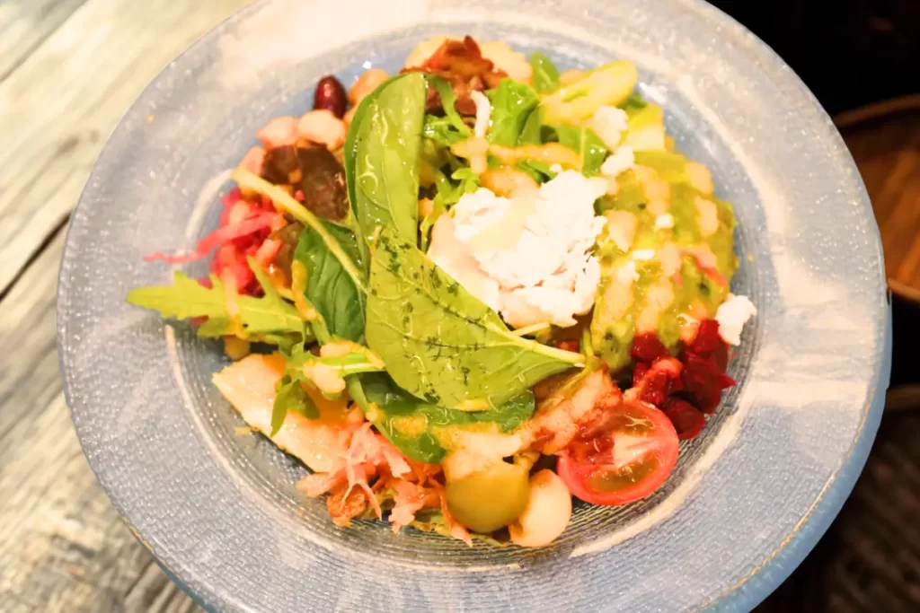 シェフ特製の人参ドレッシングに20種類の具材を贅沢に使ったオレンジの香りが爽やかなサラダです。